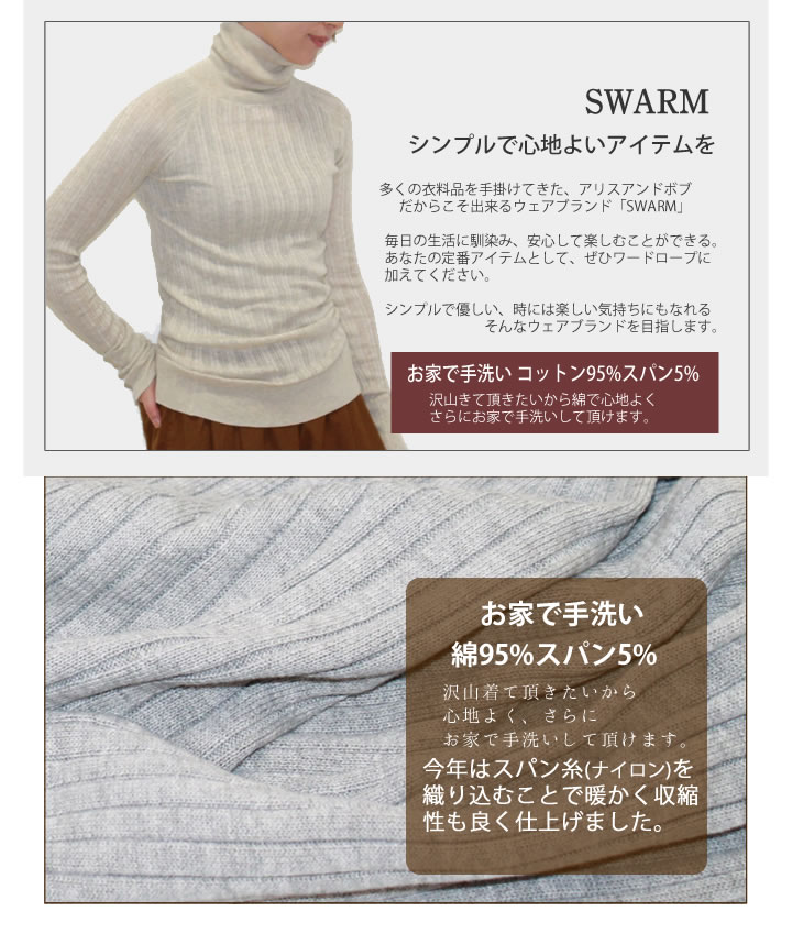 人気のコットン リブニットハイネックはなぜコットン95%になったのか? もともとはコットン100%だったのになぜコットン95%に 一見するとクオリティを落としたようですが? 実は真逆なんです5%スパン(ナイロン)系を織り込むことで 厚みを増し「暖かく」さらに「首元、袖、裾」のヨレを防ぐ効果がお家のお洗濯でもヨレにくくなり その上、何度も何度も試作を重ね、綿100%と比較してもよりふっくらと柔らかく肌に優しくなりました。