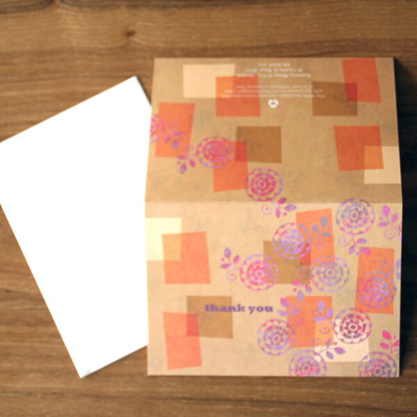 ベージュやオレンジ、ブラウンを基調に、お花模様がスタンプのように散りばめられたシックなメッセージカード。
